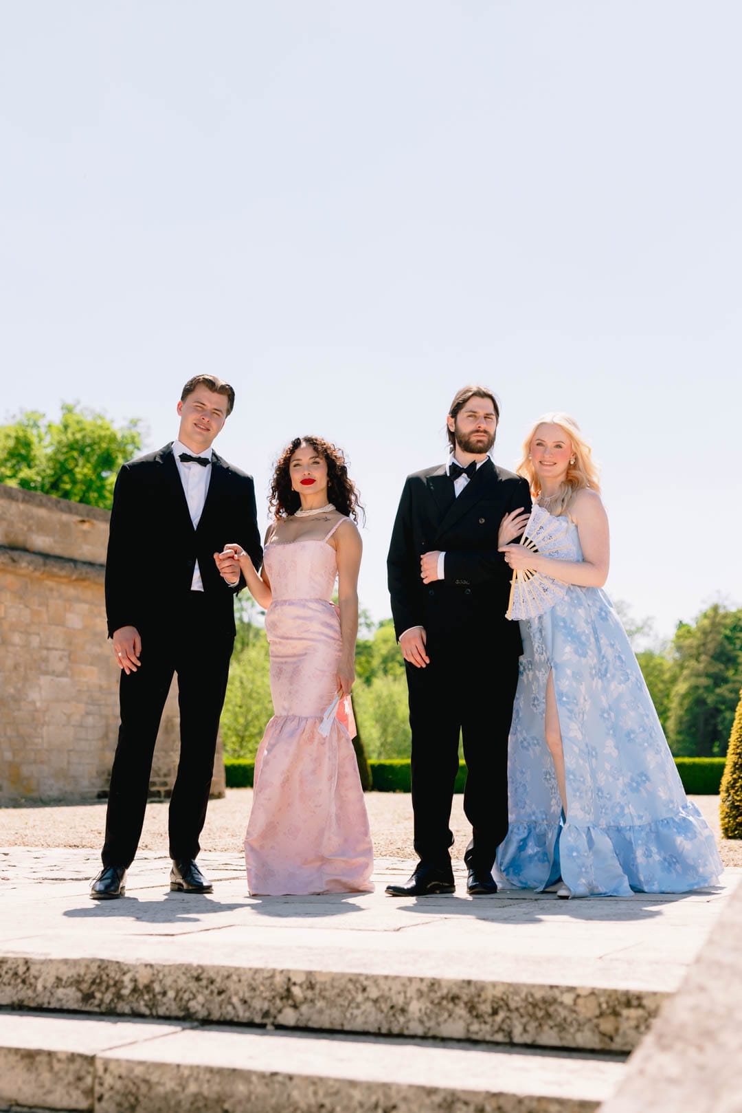 Gli abiti vintage dalle tonalità chiare hanno dato un tocco sofisticato e autentico, perfettamente in linea con l’atmosfera. A completare il quadro, una palette raffinata: rosa cipria, azzurro cielo, verde menta e tocchi dorati, perfetti per ricreare l’universo cromatico tanto caro a Marie Antoinette.