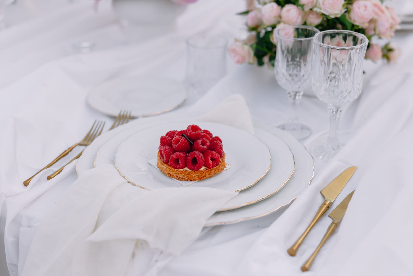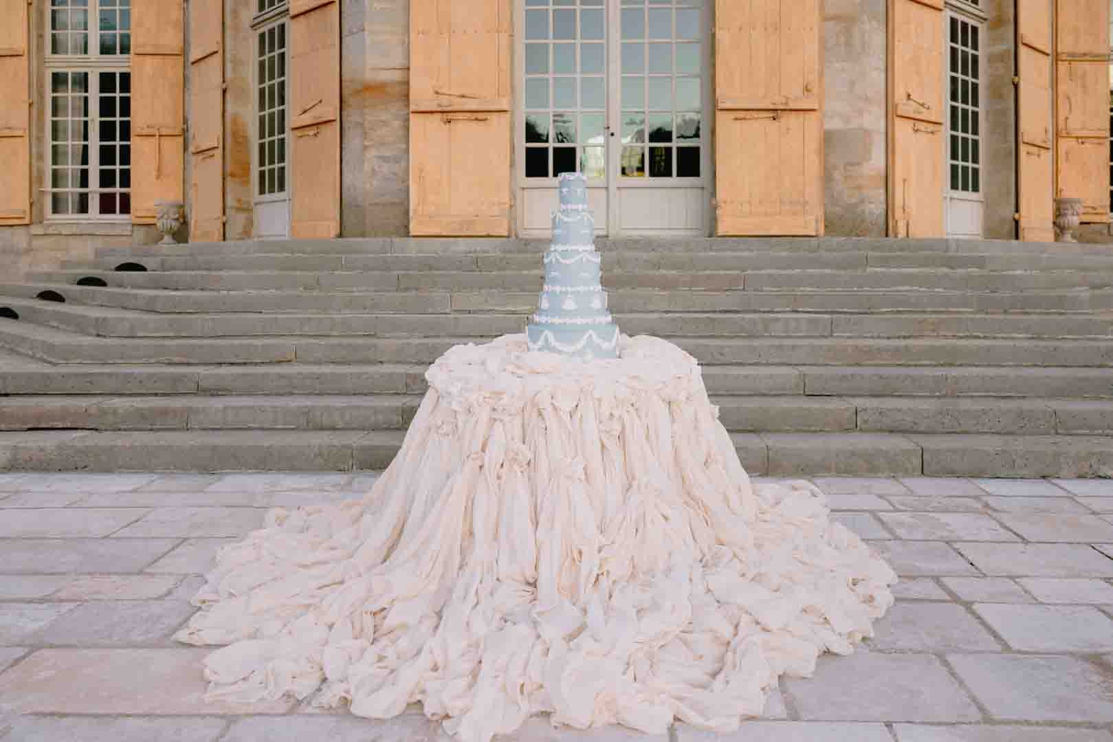 La cena si è svolta davanti allo chateau, tra tovagliati preziosi e piatti ispirati alla cucina francese. Il dessert, naturalmente, non poteva che essere una sinfonia di dolci: tortine dai colori accesi, eclair e macarons variopinti. Il momento più atteso? La torta nuziale a più piani firmata Karolien Beyens, presentata su un tavolo decorato da Mia Sylvia: un connubio perfetto di arte pasticcera e styling raffinato.